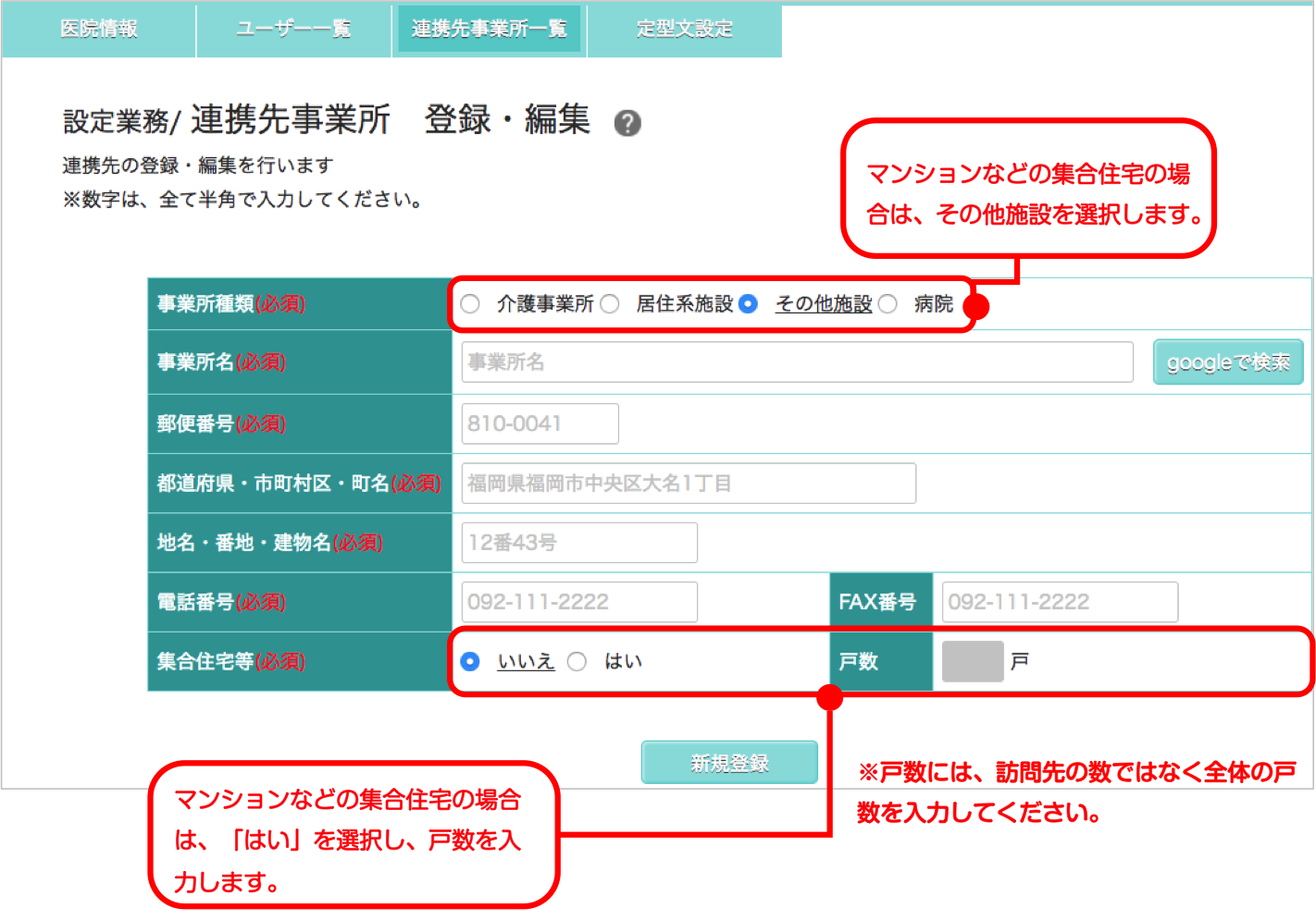 マンション等の集合住宅へ複数訪問サービスを行う場合(以下該当箇所参考)、戸数によって単位数変動するため事前に登録を行えるようにしました。