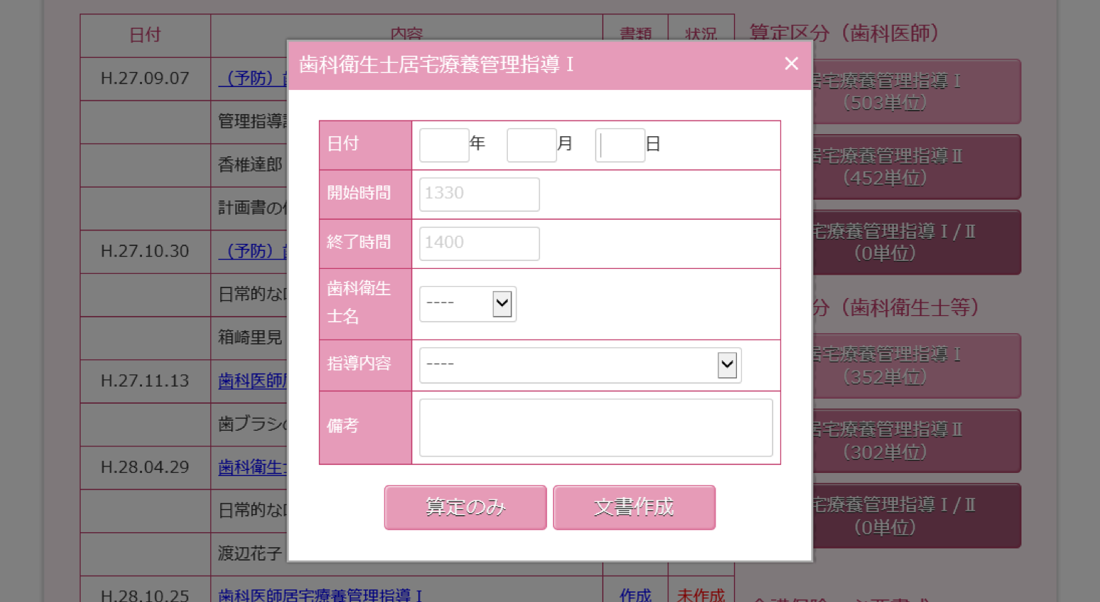 右側の「算定区分」では、歯科医師・歯科衛生士で算定するボタンが分かれており、算定したいボタンを押すと、内容が表示します。