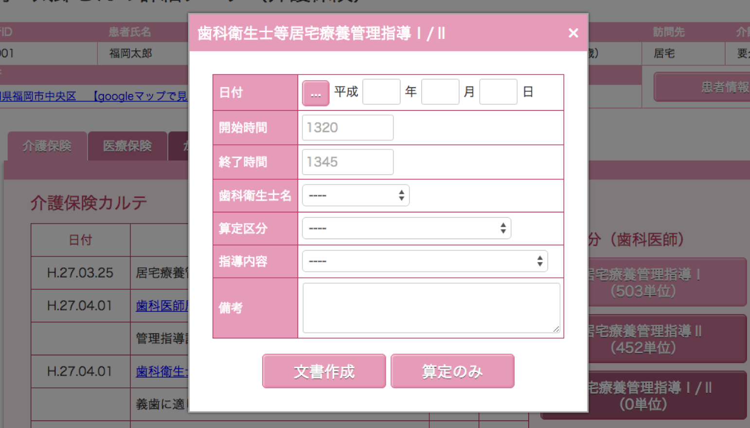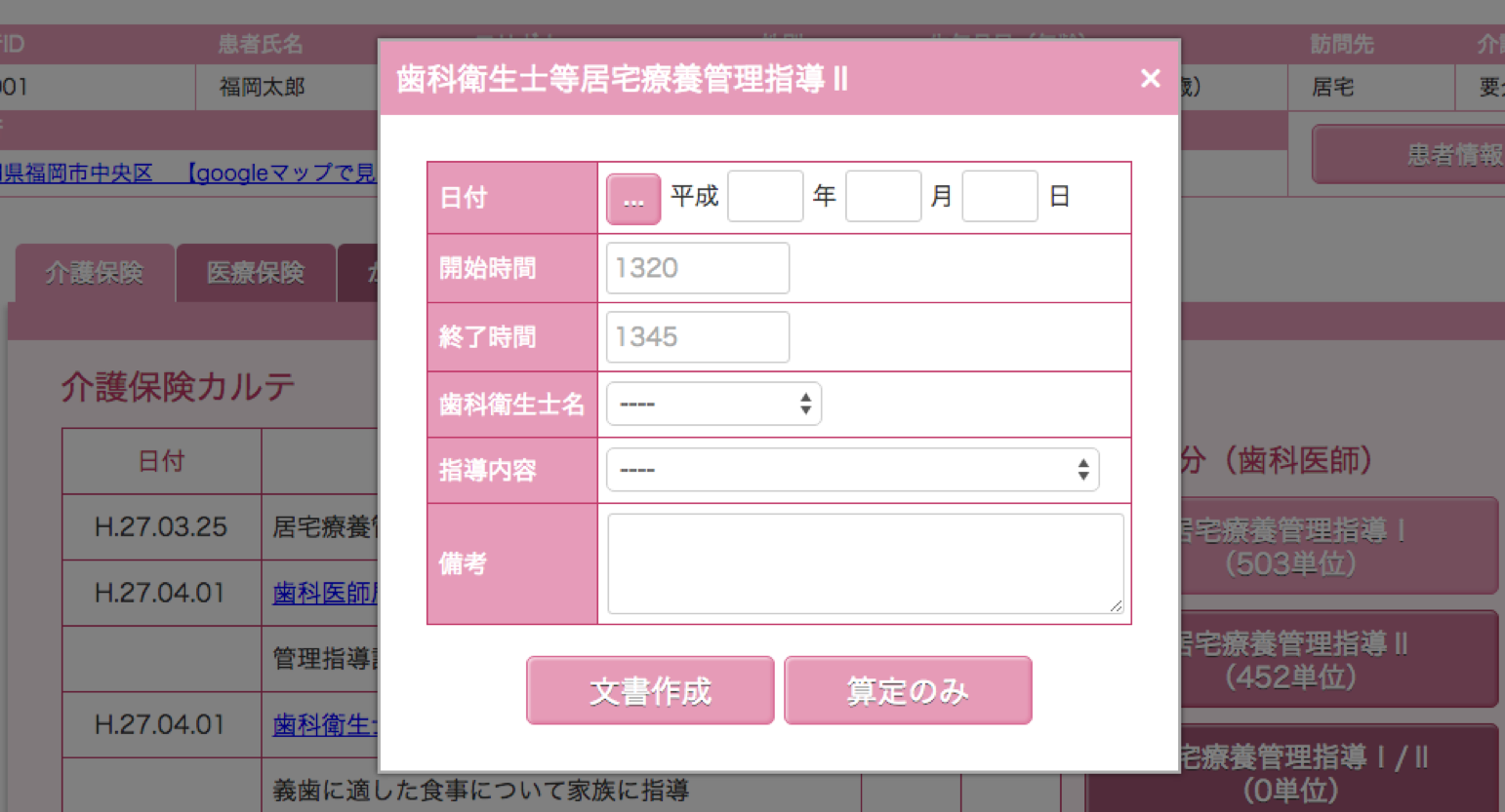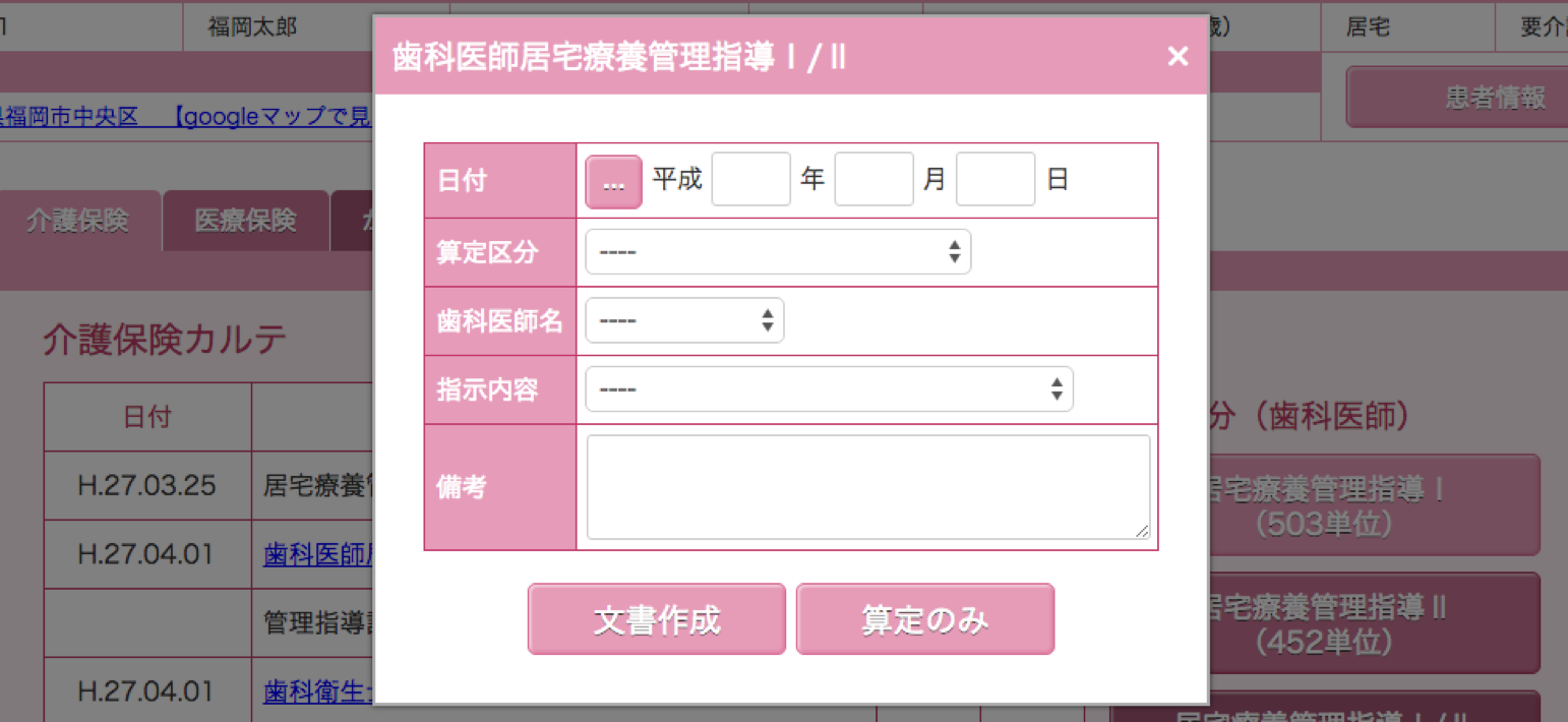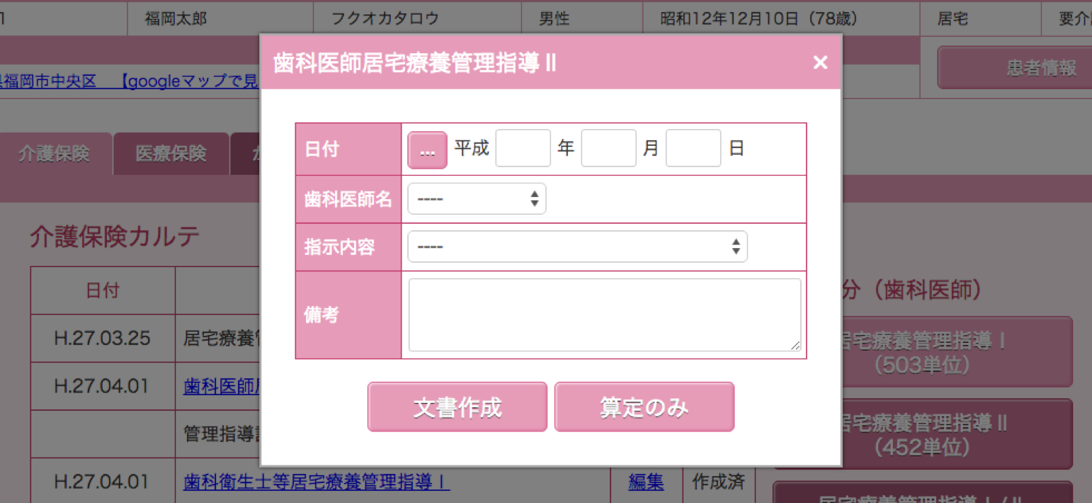 このページでは、介護保険の算定、カルテの作成、印刷が行えます。