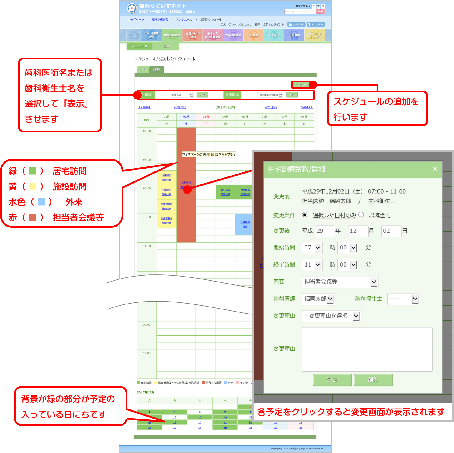 週別のスケジュール画面では、登録スタッフの週間別のスケジュールが確認できます。