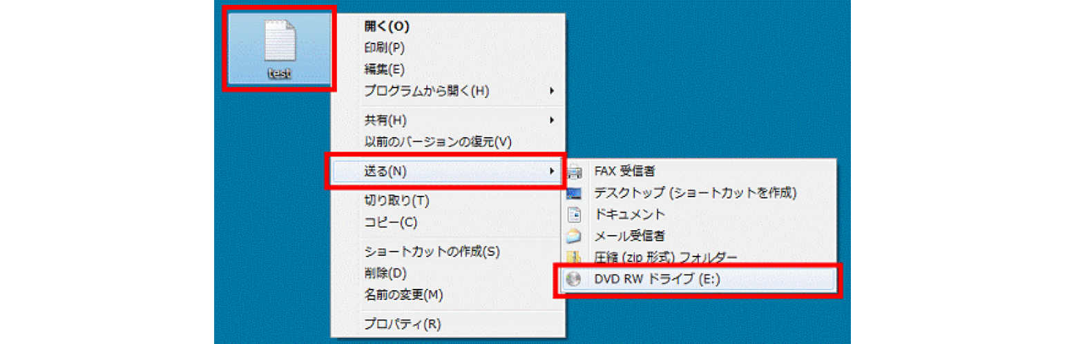 2.書き込みたいファイルを右クリックし、表示される一覧から「送る」→「DVD RW ドライブ(E:)」(または「BD-RE ドライブ(E:)」)の順にクリックします。
