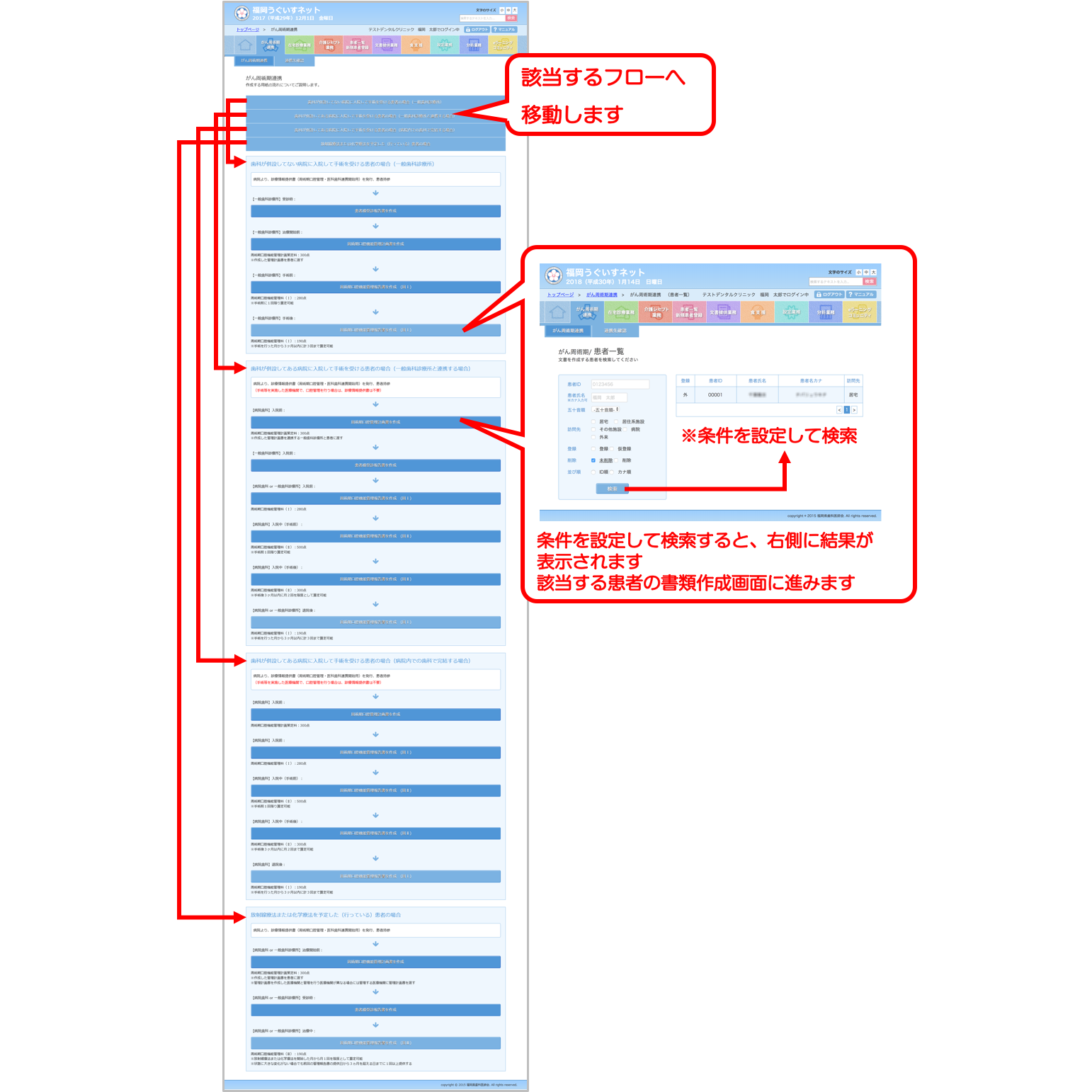 該当するフロー(書類作成手順)に移動しますので作成する書類のボタンを押すと患者検索(がん周術期/患者一覧)に移動し、文書の作成が行えます。