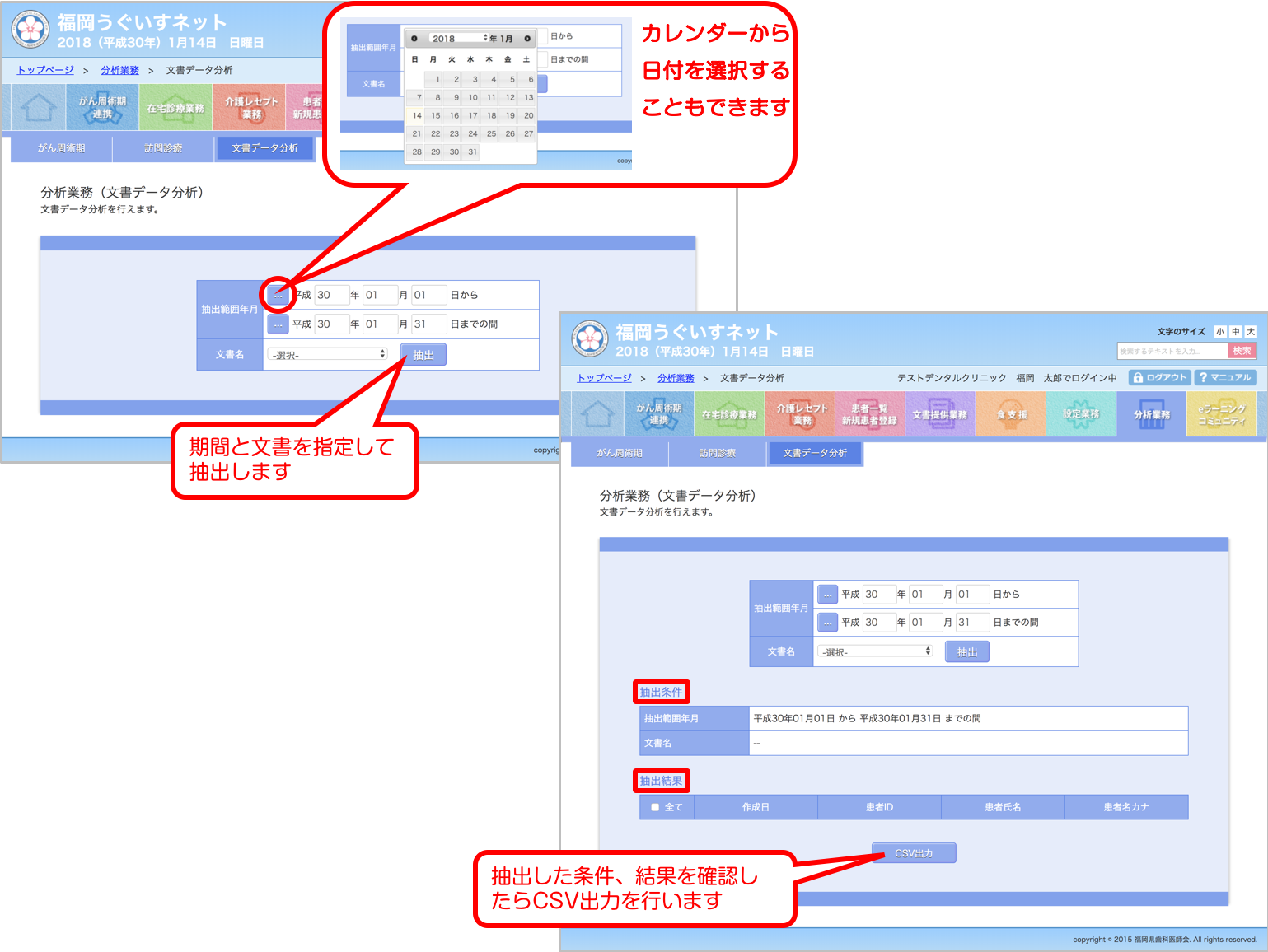 作成した文書に関する情報の情報を元に、集計データを作成しCSV形式で出力できます。