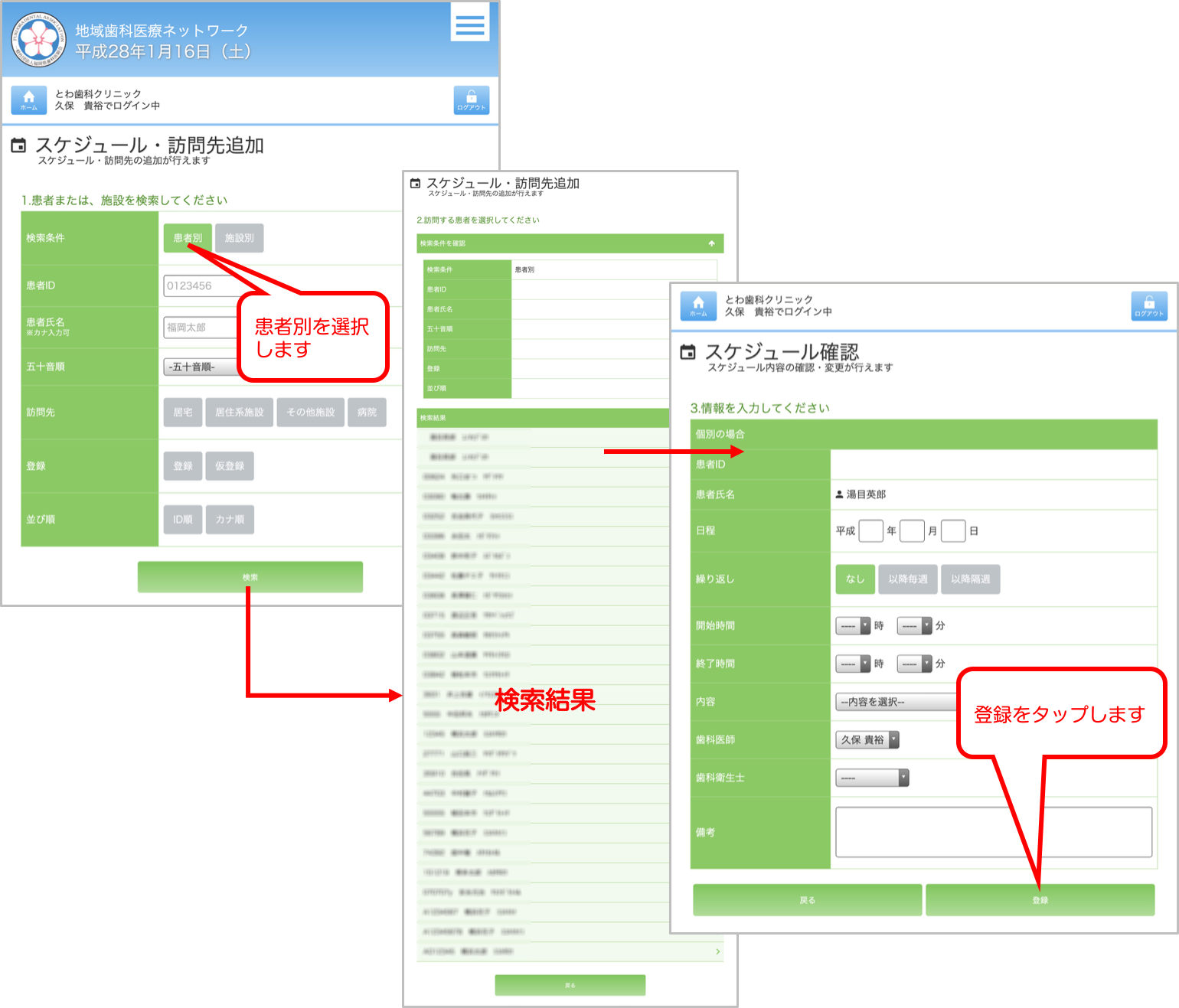訪問を行う患者名をタップし、患者のスケジュール確認画面すすみ、日程・時間・時間の間隔等の情報を入力し、最後に登録ボタンを押すと、登録が完了します。