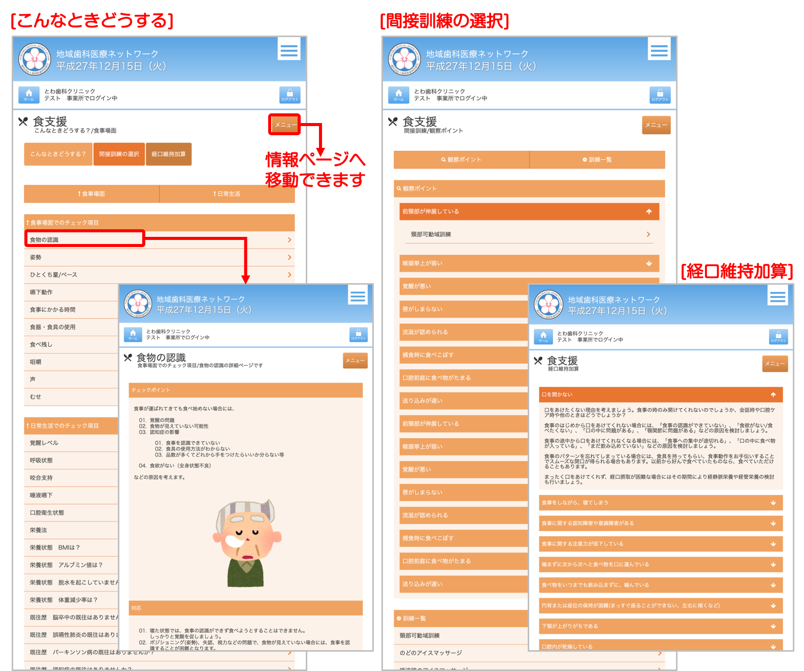 フッターメニューから「食支援」をタップして移動します。こちらのページでは、食支援に関わる情報の確認が行えます。