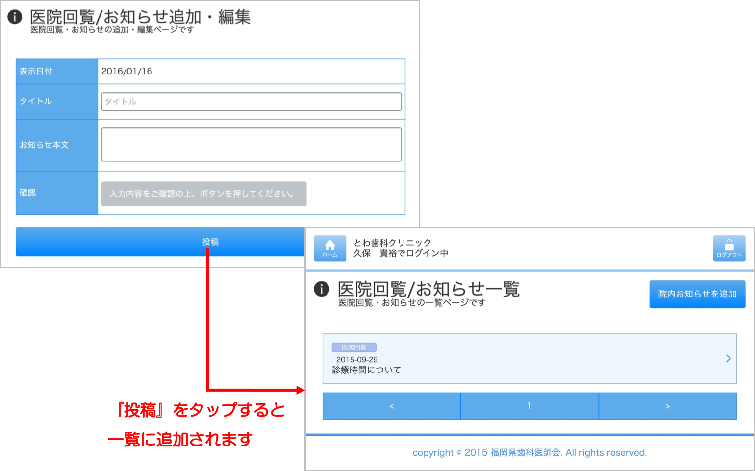「院内お知らせを追加」をタップするとこのページへ移動します。